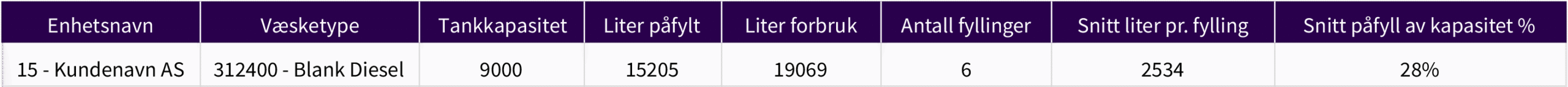 Eksempelet her viser at tanken er fylt 6 ganger, mens halvparten hadde vært mer enn nok i forhold til forbruket. Med oversikten i appen og en månedlig oppsummering er det lettere å ta bedre valg for den kommende måneden. Her kan både kunde, leverandør og miljøet spare på at det kjøres færre turer. Brukerne er like fornøyde ettersom det alltid er nok drivstoff igjen.